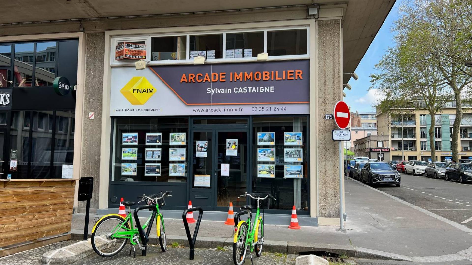 Visuel Peinture vous présente ses travaux de ravalement de façade pour l'agence immobilière ARCADE Immobilier, située au rez-de-chaussée d'un immeuble Perret au Havre. Notre équipe a été contactée pour repeindre les menuiseries et le béton qui encadre la boutique.